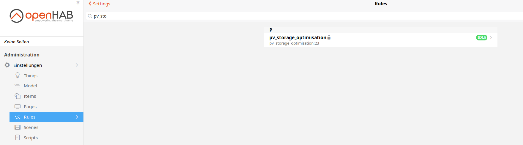 After editing and saving the rule “pv_storage_optimisation” is shown again in the rules section of the openHAB menu after a few moments :