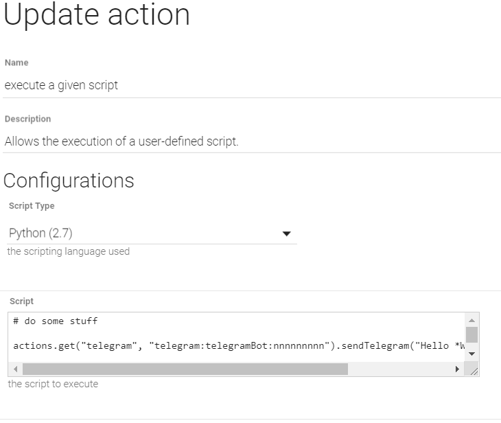 So, for example, if I create a Rule in PaperUI right now with a custom Script that needs to do some stuff and then send a Telegram using the Telegram 2.x binding’s Action it would look like:
