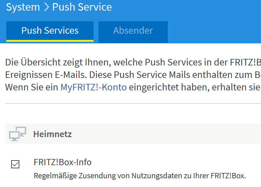 As I don’t know how to set the language to english in my FritzBox: for the others, it’s located under “system” - “Push Services”, where you can activate regularly information sent to you via push-Email.