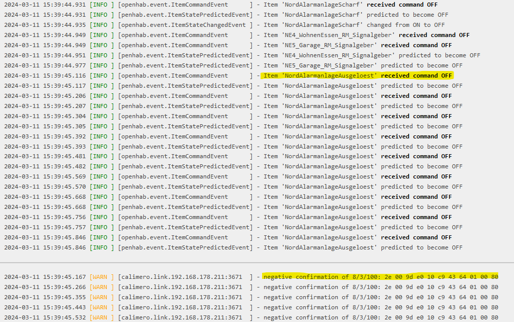 I have the problem, that after a “postUpdate” to a switch-control item the event log is flooded with many warnings “negative confirmation of 8/3/100: 2e 00 9d e0 10 c9 43 64 01 00 80”. This warning comes every 100 ms.