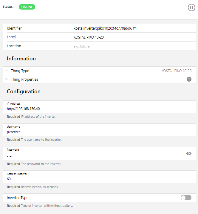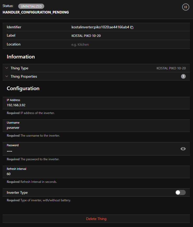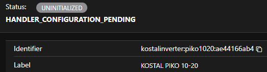 Now you should see the Kostal PIKO 10-20 at Administration / Things and hopefully is it ONLINE