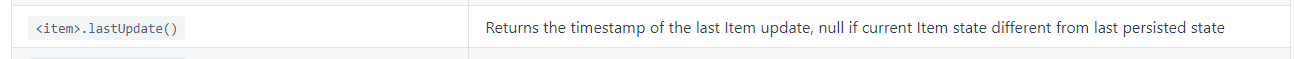 Issue of the topic: So i use lastUpdate extensively in my .rules files but more recently i kept getting failures due to null values being returned. Having read the documentation i noticed that if an update is waiting to commit to persistence then lastUpdate will return null. Not sure if this is recent change or ive just got lucky (been running these same rules since OH1). Anyway, thats how it is now, so my question is, is there a way to get the last persisted date irrespective of outstanding updates/changes… etc.