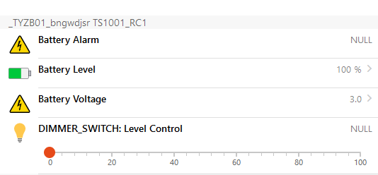 29110 71B6 XXXXXXXXXXXX5CDF END_DEVICE ONLINE 1 ZIGBEE_HOME_AUTOMATION DIMMER_SWITCH _TYZB01_bngwdjsr TS1001