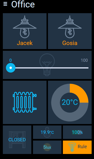 I have two main lights in my office room. Both of them are grouped and shall switch on when the movement will be recognized but only if brightness will be less then given value.