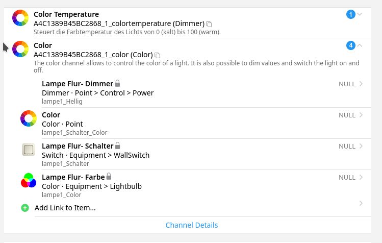 The Item “Color” (lampe1_Schalter_Color) from the channel “Color” is building by OpenHab, the other 3 Items (lampe1_helligkeit, lampe1_Schalter,…) are defined in a item-File- you can see it on the attached file: lampeZigbee.items.txt (830 Bytes)