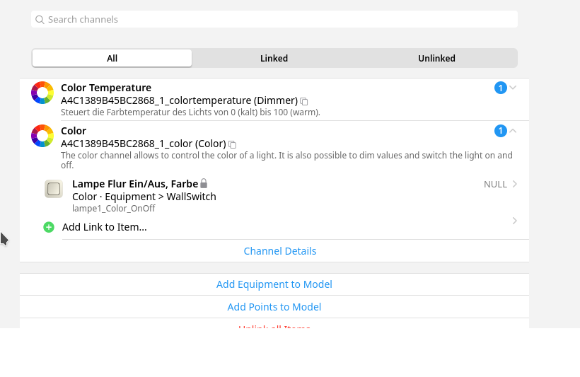 it doesn’t work. All 4 channels are online, but the values of the 3 Channels from the channel Color are null. I can set commands with the karaf-console, but nothing is going on, the values are still null.