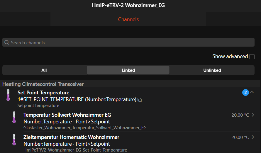 So far I’ve only been using the latest version of openHAB to visualize and automate my KNX system (MDT). Now I would like to add Homematic IP and also be able to control the setpoint temperature of the Homematic IP radiator thermostats via my MDT Glastastaster 2 Smart. To do this, I have created a channel for each of the two Things (MDT push-button / Homematic radiator thermostat) and added the two items of type Setpoint (Temperature).