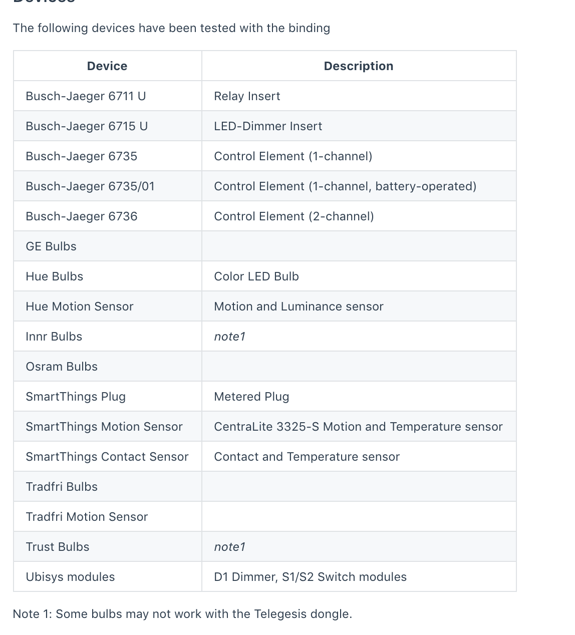 In general, the ZigBee binding should work with devices that are of similar type to those listed. The document shows the list of channels and clusters supported, but of course this probably doesn’t mean anything to you, and it’s sometimes difficult to find out from documentation how the device works.