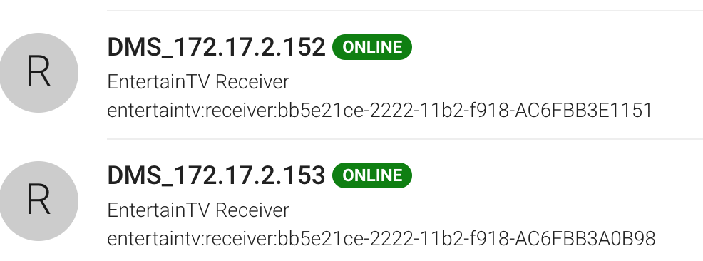 2018-11-01 17:34:25.540 [DEBUG] [very.EntertainTVDiscoveryParticipant] - EntertainTV: Discovered an EntertainTV Receiver ‘DMS_172.17.2.152’, UDN: ‘bb5e21ce-2222-11b2-f918-AC6FBB3E1151’, Model dms_tpb.1.1
