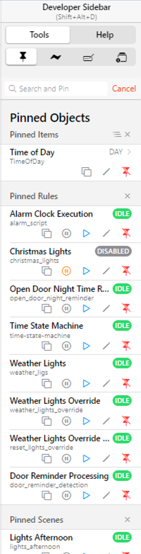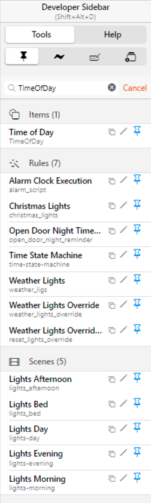 The nice thing about the developer sidebar is it searches all OH entities and lets you pin the Things, Items, Rules, Pages, etc. for handy navigation and interaction right there on the side.