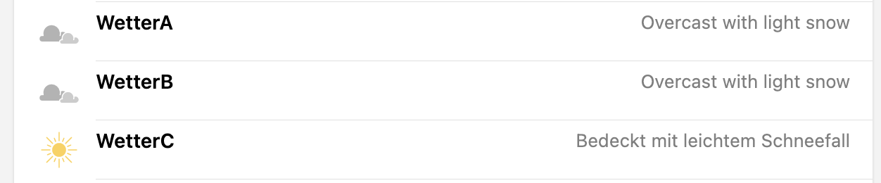 At the “day0CondA” item (“WetterA”) I get the correct icon numbers for iday (1 to 17) and the corresponding English text explaning the weather condition (also is it unclear to me how 2 parameters are attached to an item, the number between 1 and 17 as well as the text “overcast with light snow”. At the “day0CondC” (“WetterC”) my mapping converts the item number to the German text correctly, but the iday icon is not selected anymore as the icon’s state gets the mapped text: