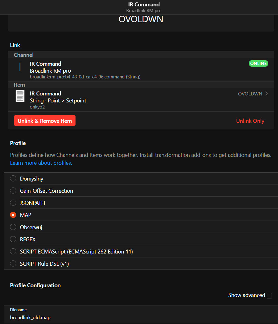 | 16:19:56.605 | TRACE | openhab.event.ThingStatusInfoChangedEvent | Received event of type ‘ThingStatusInfoChangedEvent’ under the topic ‘openhab/things/broadlink:rm-pro:b4-43-0d-ca-c4-96/statuschanged’ with payload: ‘[{status:ONLINE,statusDetail:NONE},{status:OFFLINE,statusDetail:CONFIGURATION_ERROR,description:No entries found for command in map file, or the file is missing.}]’ |