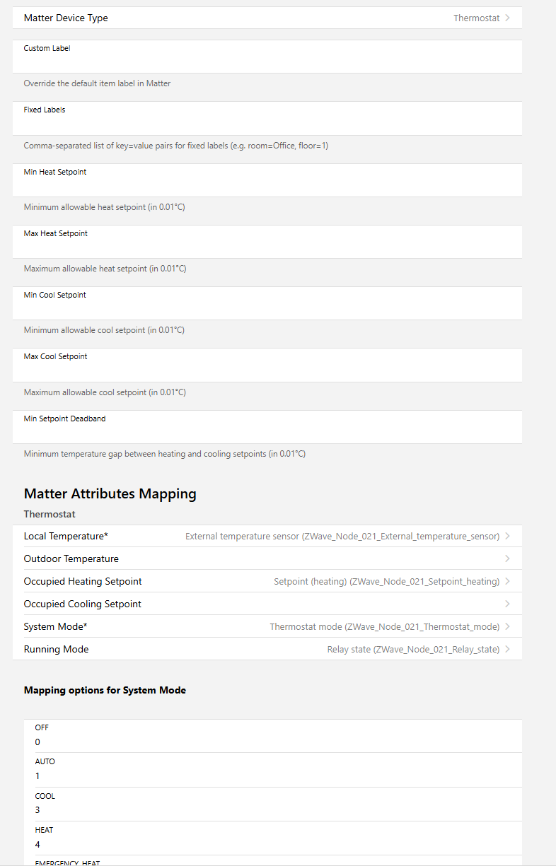 Error: org.openhab.binding.matter.internal.client.MatterRequestException: Error: Error initializing oh-bridge.aggregator.ZWave_Node_021.thermostat Cause: Error: Validating oh-bridge.aggregator.ZWave_Node_021.thermostat.state.systemMode: Conformance āAUTOā: Matter does not allow enum value Auto