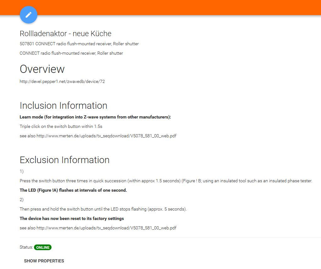 Finally I want to inform you that the Merten (507801) Roller Shutter is now working correctly, Chris has updated the database , he removed the the links “Dimmer” and “Dimmer2” of the thing and replaced “Dimmer1” by a “Blinds” link. Now the roller shutter Merten (507801) is working correctly. Thanks again to Sihui and Chris.