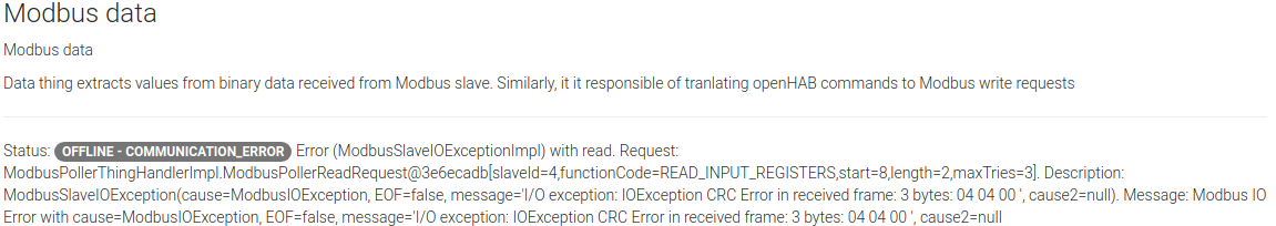 15:19:14.221 [TRACE] [ort.modbus.internal.ModbusManagerImpl] - Calling write response callback org.openhab.binding.modbus.internal.handler.ModbusPollerThingHandlerImpl$ReadCallbackDelegator@329aace8 for request ModbusPollerThingHandlerImpl.ModbusPollerReadRequest@c19d0d4[slaveId=64,functionCode=READ_INPUT_REGISTERS,start=8,length=2,maxTries=3]. Error was org.openhab.io.transport.modbus.internal.ModbusSlaveIOExceptionImpl Modbus IO Error with cause=ModbusIOException, EOF=false, message='I/O exception: IOException CRC Error in received frame: 3 bytes: 40 04 00 ', cause2=null