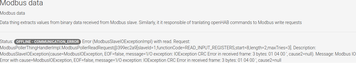 15:19:14.185 [ERROR] [ort.modbus.internal.ModbusManagerImpl] - Last try 3 failed when executing request (ModbusPollerThingHandlerImpl.ModbusPollerReadRequest@c19d0d4[slaveId=64,functionCode=READ_INPUT_REGISTERS,start=8,length=2,maxTries=3]). Aborting. Error was I/O error, so reseting the connection. Error details: net.wimpi.modbus.ModbusIOException I/O exception: IOException CRC Error in received frame: 3 bytes: 40 04 00 [operation ID 452bab5e-5eff-49aa-872e-7add789af404]