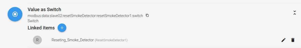 Switch SmokeDetector01_Switch "SmokeDetector01_Switch [%d]" <smoke> { channel="modbus:data:slave0x80:smokeDetector:smokeDetector01:switch" }