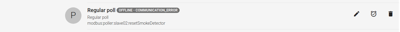 15:19:14.224 [INFO ] [smarthome.event.ThingStatusInfoEvent ] - 'modbus:poller:slave0x40:smokeDetector' updated: OFFLINE (COMMUNICATION_ERROR): Error with read: org.openhab.io.transport.modbus.internal.ModbusSlaveIOExceptionImpl: Modbus IO Error with cause=ModbusIOException, EOF=false, message='I/O exception: IOException CRC Error in received frame: 3 bytes: 40 04 00 ', cause2=null