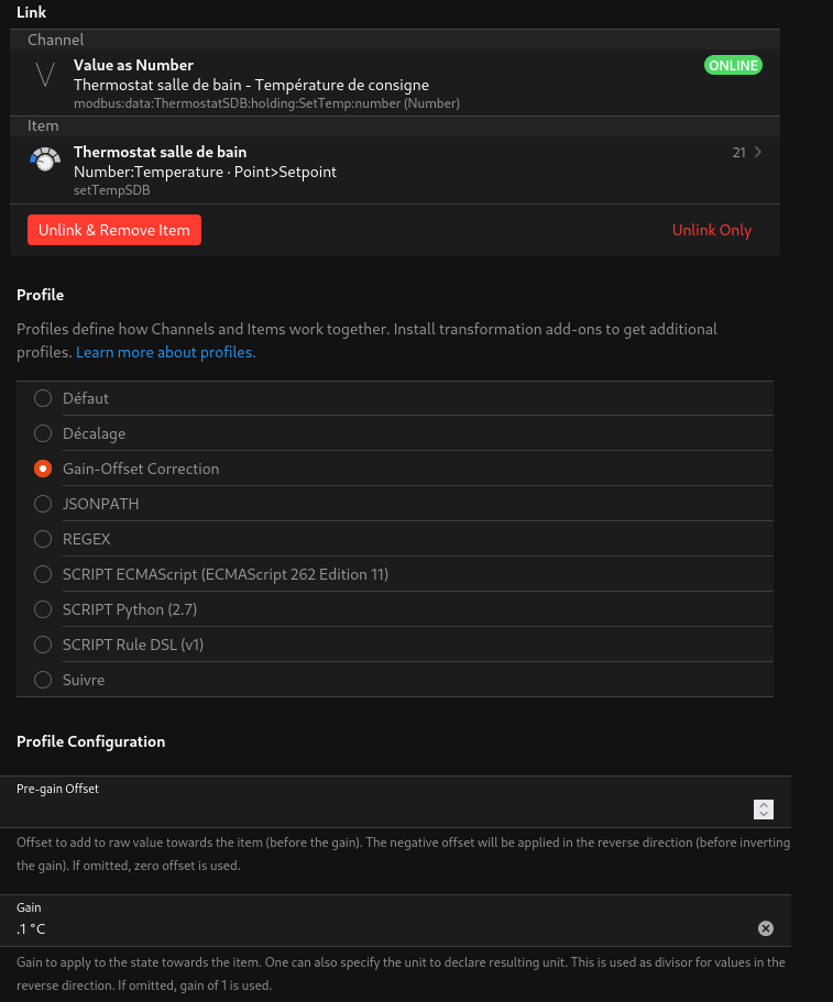 2023-09-23 15:47:01.296 [WARN ] [nal.profiles.ModbusGainOffsetProfile] - Cannot apply gain ('0.1 °C') and pre-gain-offset ('0') to state ('24') (formula '24'/'0.1 °C' - '0') because types do not match (towardsItem=false): Cannot process command '24', unit should compatible with gain