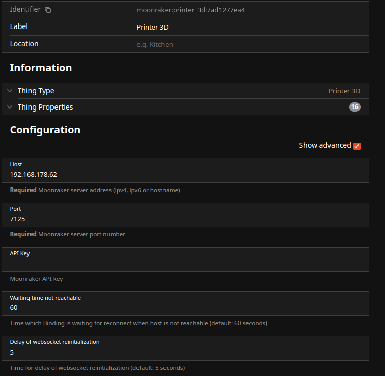 In the advanced config part you could also configure a other port, api key (not needed if not configured on moonraker/klipper side), or change the timeouts for the websocket reconnect