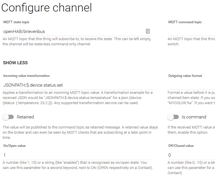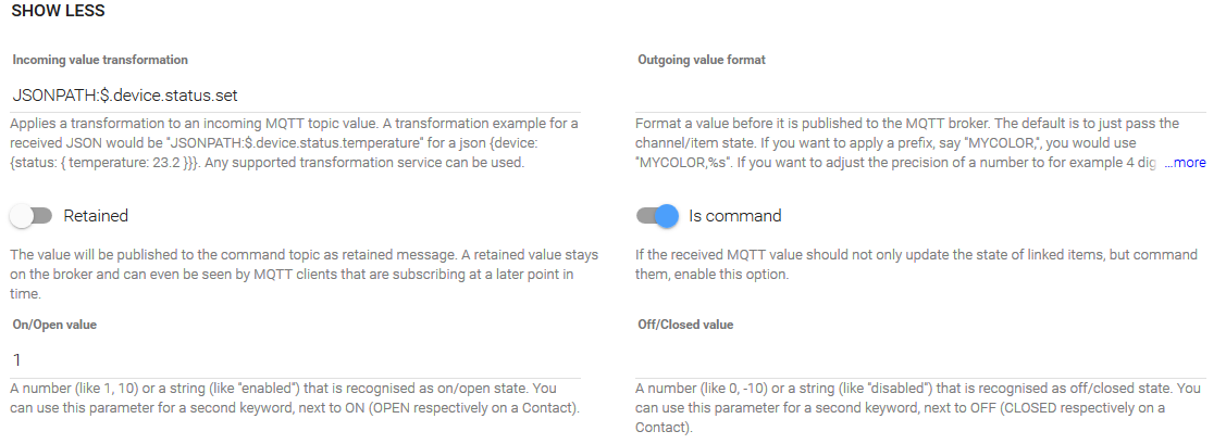 Switch relay1_1 “Bedroom 1 Light” (MH_Bed1, Lights) { mqtt=“<[broker:domogik/out/relay/r1:state:MAP(onoff4.map)],>[broker:domogik/in/relay/r1:command:ON:1],>[broker:domogik/in/relay/r1:command:OFF:0],>[broker:domogik/in/relay/r1:command:TOGGLE:2]” }