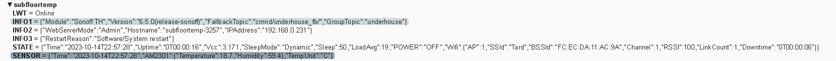 23:14:33 MQT: tele/subfloortemp/SENSOR = {"Time":"2023-10-14T23:14:33","AM2301":{"Temperature":18.7,"Humidity":56.0},"TempUnit":"C"}