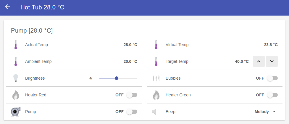 There is one thing that’s bugging me, and I hope someone might have a better solution. Currently, I have two items to heat the tub: ‘Heater Red’ and ‘Heater Green.’ These indicate the state when the tub has reached temp and when it hasn’t. I would like this to be a single ‘Heater’ item that indicates red, green, or off. Any ideas? Thanks.