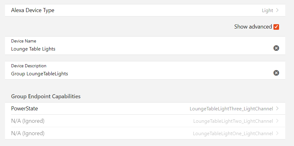 I have attached Alexa metadata to the group, and saw the warning that there was no metadata associated with the group members. So I added metadata there too although, as this screen shot shows, it only allowed me to configure one of the three outputs: