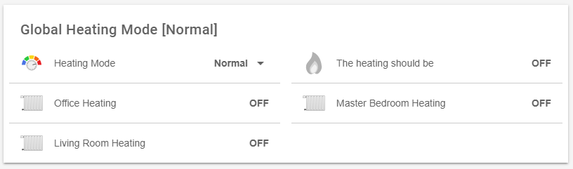 The following is mostly from the Heating Boilerplate, so it’s better explained there, but this is the current heating mode, and items to contain the current preset temperatures.