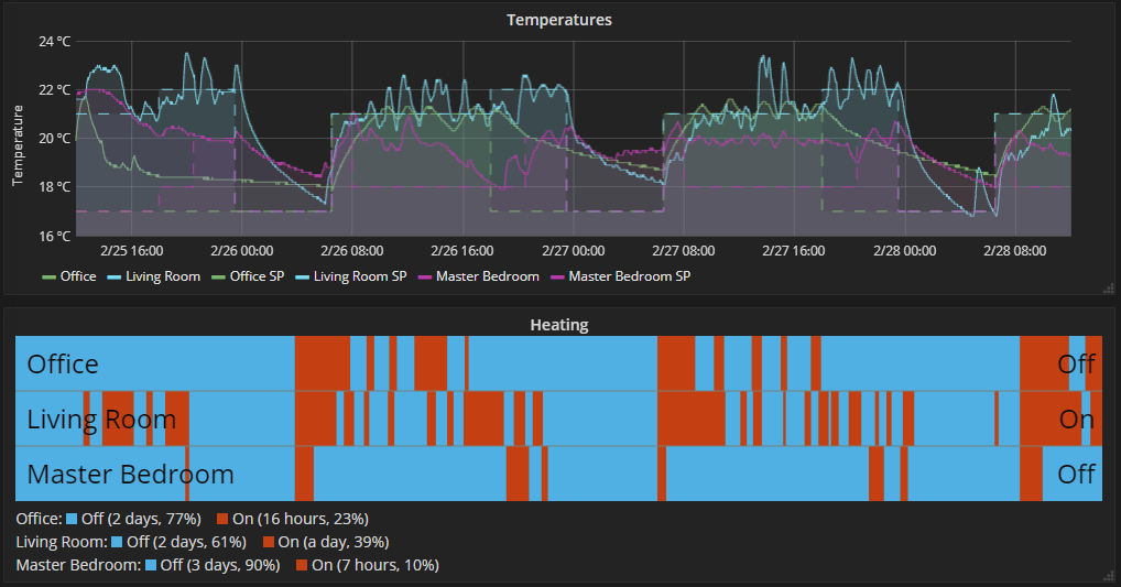 You can really see how this works when you look at the below graphs from Grafana - it shows the target temperatures as dashed lines, the current temperature as a solid line, and the second graph shows when each actuator was on or off.