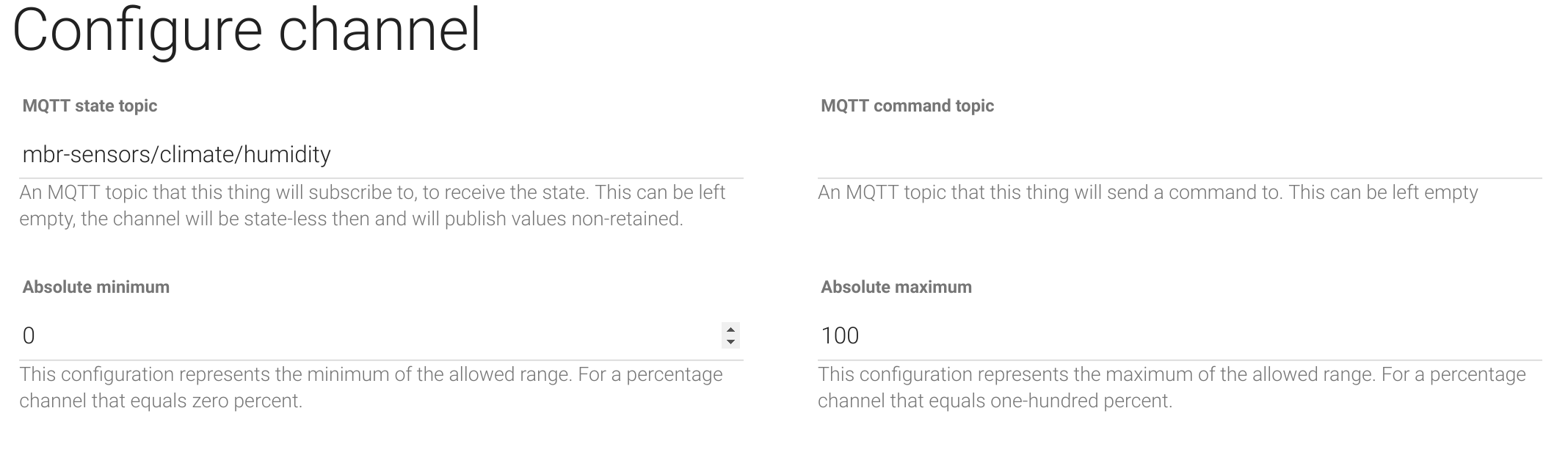 The sensors are all pretty straight forward. They are Number values so we use a Number type Channel. Humidity is a percent so we could theoretically use a Percent type Channel but I chose to just use a Number and set the min value to 0 and max value to 100.