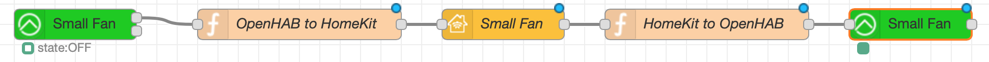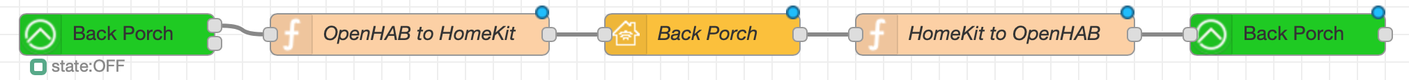 These functions “translate” the commands to/from OpenHAB/HomeKit. Pretty straightforward I think except the msg.hap.context which is only “undefined” if the message didn’t come from HomeKit (if you use your phone or siri to control an item then hap.context is NOT undefined - so the first line returns “true”). This prevents loops since the HomeKit node passes everything through. This if statement is used in all of my outgoing functions.