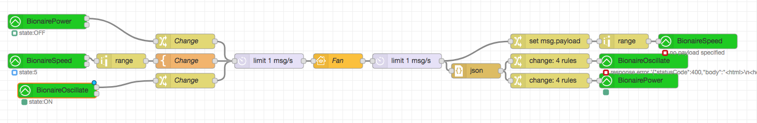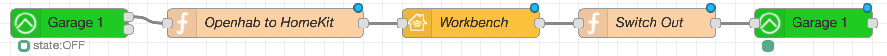 The special item here is my global variable. It holds on to the previous state when the item is turned off. This is because HomeKit always remembers the previous state of a dimmer and restores that state with a simple {“On”: true} message. Since OpenHAB doesn’t remember the previous state I just keep it saved in a node-red context variable (context stays only within the current flow).