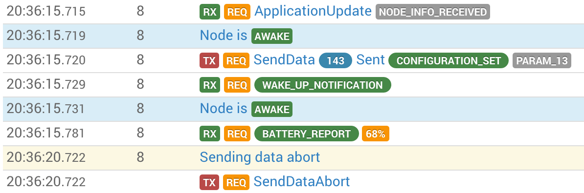 This clearly shows the NIF received, then the binding sending the CONFIGURATION_SET command, and then the WAKEUP_NOTIFICATION is received. The device does not respond to this - I’m open to other thoughts of course on how to interpret this but it would be interesting to see what happens when the device wakes up by itself.