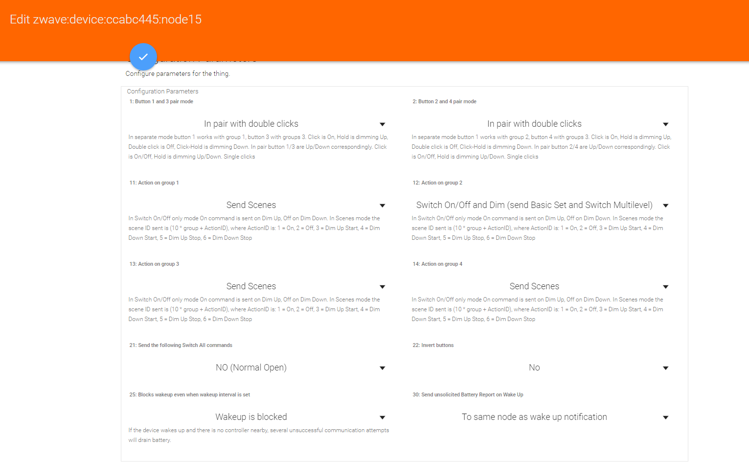 It is recognized with the correct configuration: for four groups A, B, C and D. Three groups are sending scene numbers and the other group is associated with a fibaro dimmer.