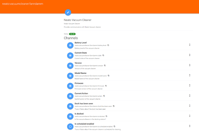 I have implemented a function in the binding so the username and password towards Neato Web cloud replaces the need for getting the vacuum cleaner’s serial and secret strings. So - basicly, the binding should be added, the username/pwd should be entered and then the vacuum will appear in the openhab inbox. Have some debug regarding timing issues left, and then I would be really glad to give you the jar file for further testing/input.