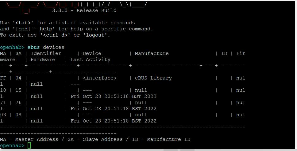 With ebusd stopped, run the “ebus devices” once more in you openhab-cli console to check if you now get device id’s. If both don’t give better (or other) results, we can always try to make things better by making ebusd and openhab working together.