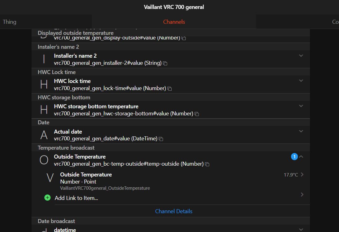 Note that some channels have additional configuration possibilities (“configure channel”) where you can set openhab to poll that channel every x seconds (start with 10 and just let it run as a test, usually you don’t need to poll that often). Just try it out if this gives some values.