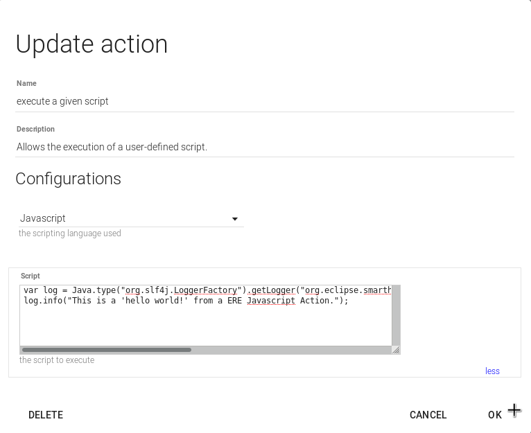 2018-09-19 02:06:57.515 [INFO ] [org.eclipse.smarthome.automation.module.script.rulesupport.internal.shared.SimpleRule] - This is a 'hello world!' from a ERE Javascript Action.