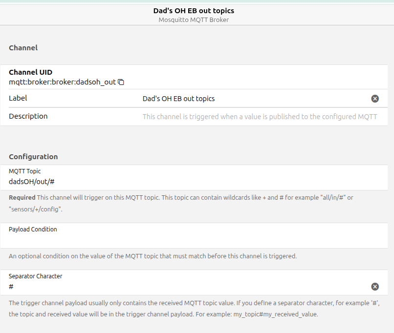 UID: mqtt:topic:ihs:MQTT_Local_Cmnd_Listener label: MQTT_Local_Cmnd_Listener thingTypeUID: mqtt:topic configuration: {} bridgeUID: mqtt:broker:ihs channels: - id: MQTT_Generic_Cmnd_Listener_Channel channelTypeUID: mqtt:trigger label: MQTT_Generic_Cmnd_Listener_Channel description: “” configuration: stateTopic: app/openhab/+/cmnd/+ -
