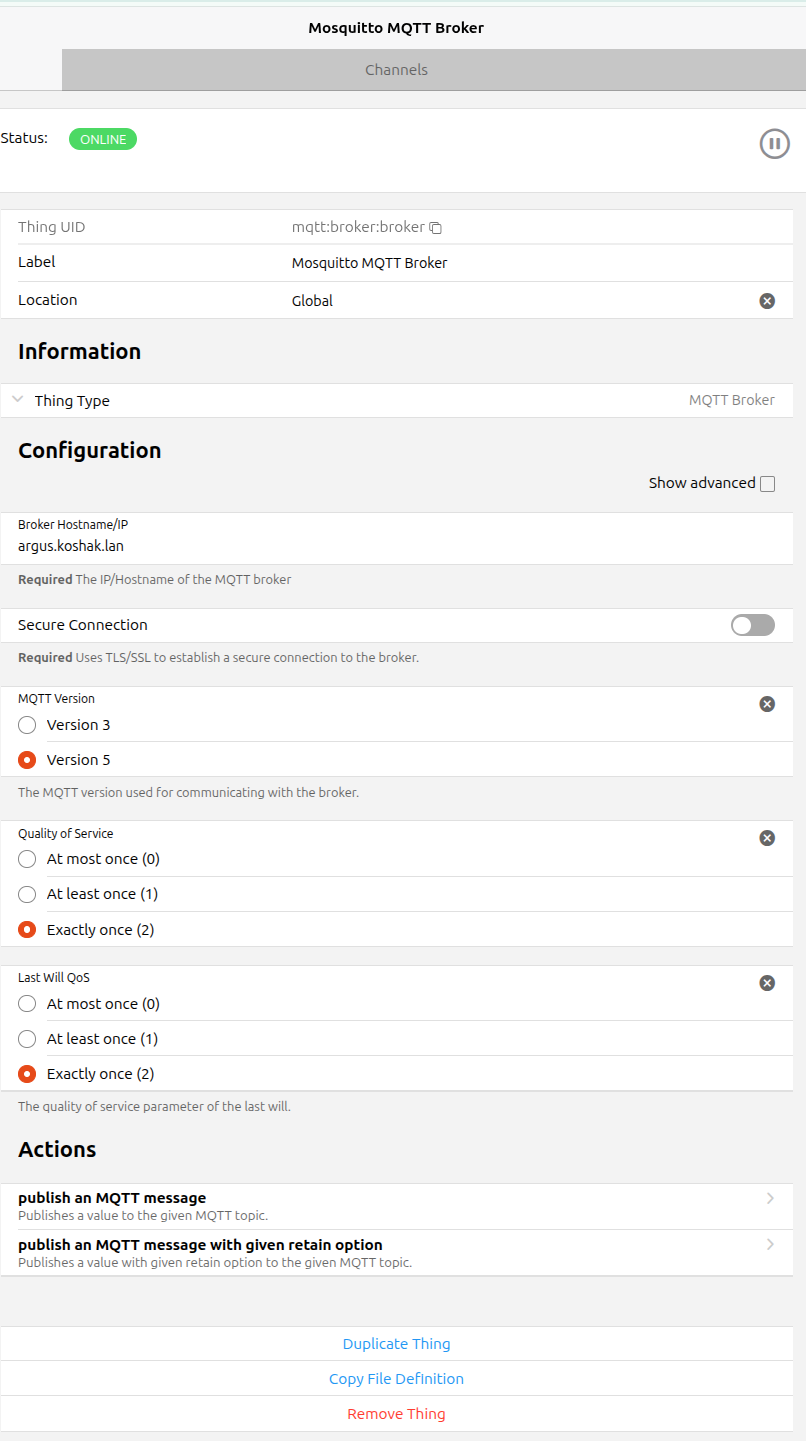 UID: mqtt:broker:ihs label: MQTT Broker thingTypeUID: mqtt:broker configuration: lwtQos: 0 publickeypin: true clientID: [masked] certificate: [masked] hostnameValidated: false lwtMessage: offline birthRetain: true secure: true certificatepin: true password: [masked] protocol: TCP qos: 1 mqttVersion: V5 host: [masked] enableDiscovery: true birthTopic: app/openhab/system/state keepAlive: 60 publickey: [masked] birthMessage: online lwtTopic: app/openhab/system/state shutdownRetain: true reconnectTime: 60000 port: 8883 lwtRetain: true username: [masked] -