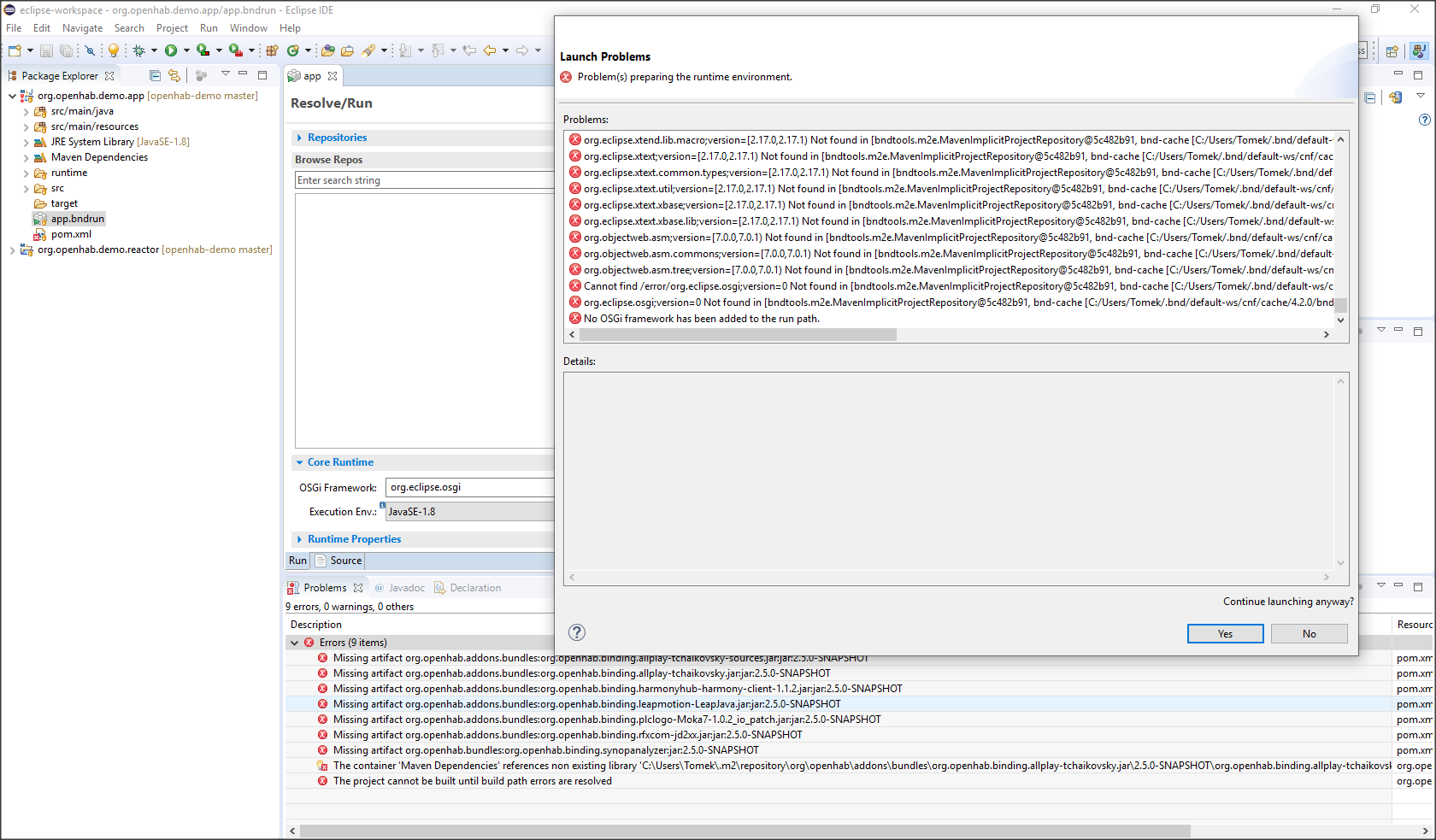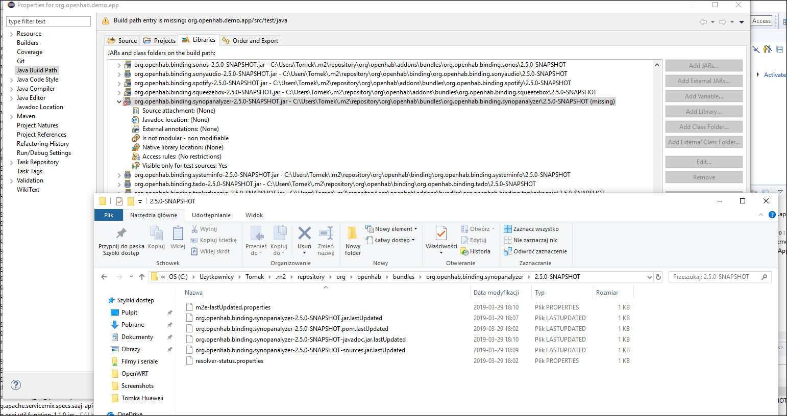 The container ‘Maven Dependencies’ references non existing library ‘C:\Users\Tomek.m2\repository\org\openhab\bundles\org.openhab.binding.synopanalyzer\2.5.0-SNAPSHOT\org.openhab.binding.synopanalyzer-2.5.0-SNAPSHOT.jar’