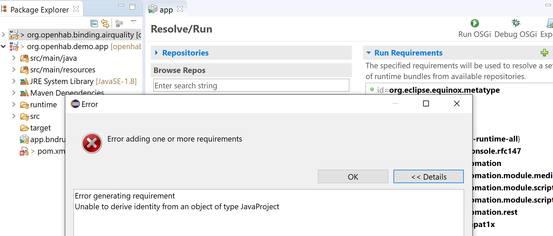 I imported the Air Quality binding as existing Maven project and added the Air Quality binding to /pom.xml in org.openhab.demo.app. But if I drag the binding to the Run Requirements, Eclipse comes with an error popup: “Error adding one or more requirements. Unable to derive identity from an object of type JavaProject”.