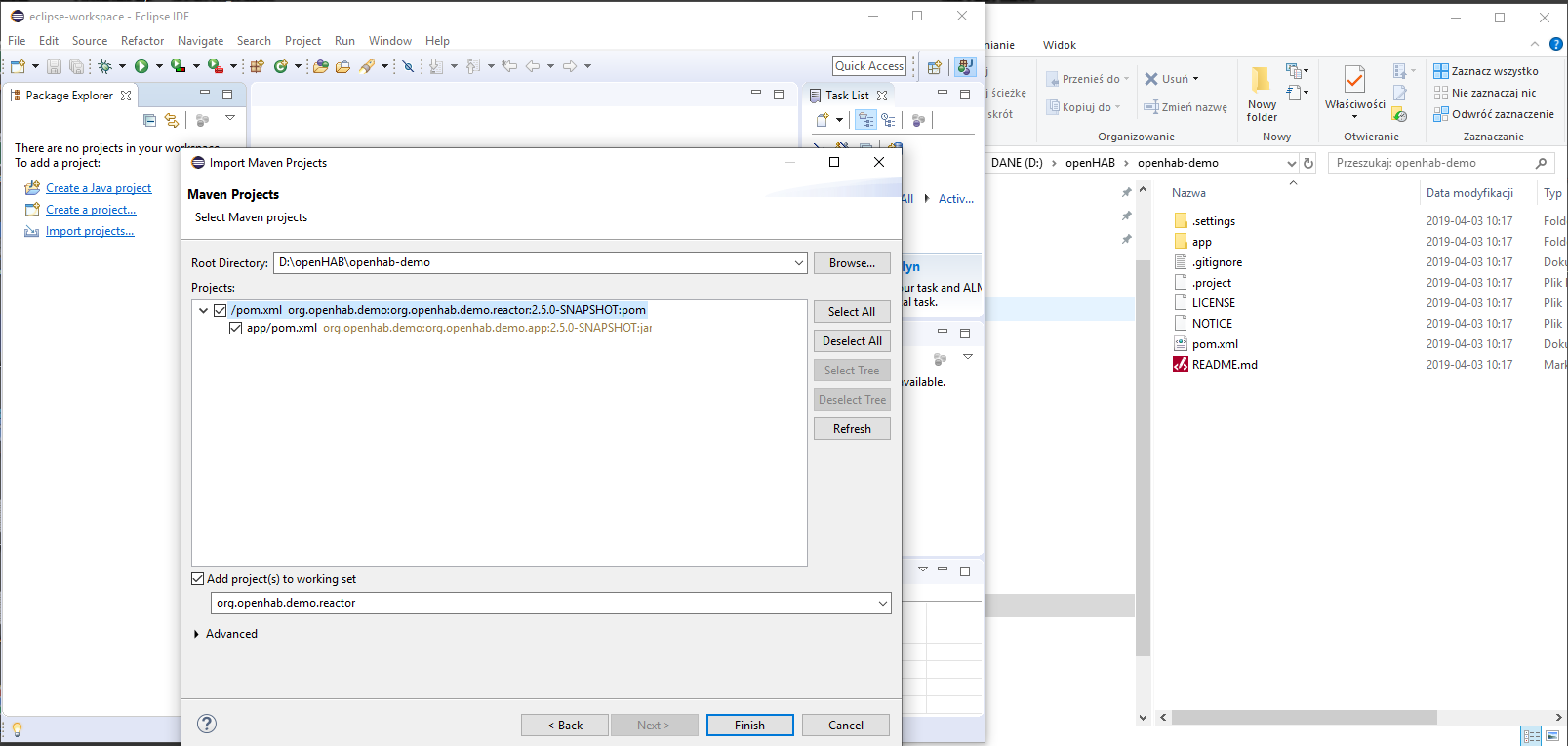 I’ve picked up Maven->Existing Maven Projects and selected folder where I git openhab-demo.