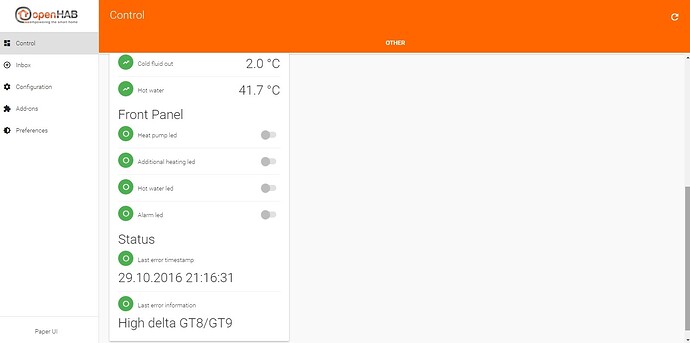 address is the ip address of of the heat pump and the refreshInterval is the interval in seconds used to refresh the values. One can also specify a tcp port to be used with the connection. So if one also runs the above mentioned simulator you are now able to read simulated values from the “heat pump”.
