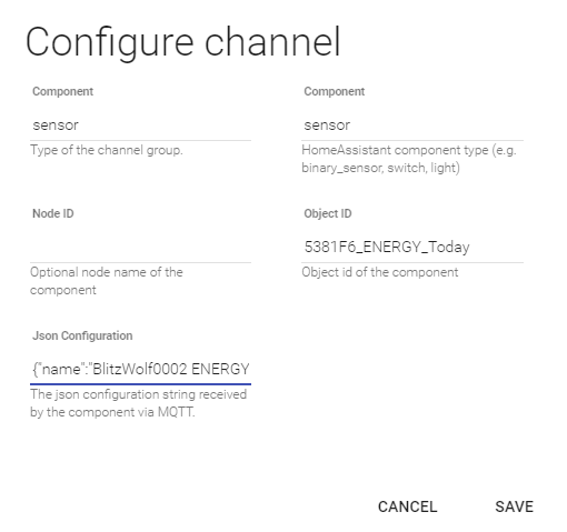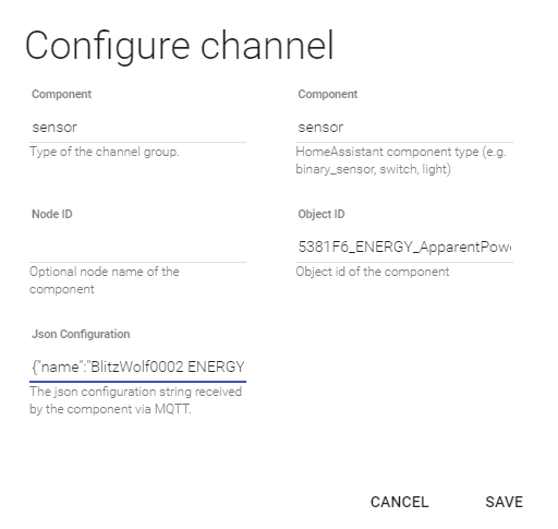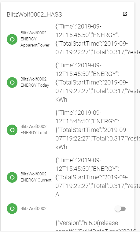 2019-09-12 20:07:33.397 [vent.ItemStateChangedEvent] - mqtt_homeassistant_5381F6_5cef27a7_5381F6_5381F6_5FENERGY_5FPower_sensor changed from {“Time”:“2019-09-12T19:02:32”,“ENERGY”:{“TotalStartTime”:“2019-09-07T19:22:27”,“Total”:0.317,“Yesterday”:0.066,“Today”:0.066,“Period”:0,“Power”:0,“ApparentPower”:0,“ReactivePower”:0,“Factor”:0.00,“Voltage”:0,“Current”:0.000}} to {“Time”:“2019-09-12T19:07:33”,“ENERGY”:{“TotalStartTime”:“2019-09-07T19:22:27”,“Total”:0.317,“Yesterday”:0.066,“Today”:0.066,“Period”:0,“Power”:0,“ApparentPower”:0,“ReactivePower”:0,“Factor”:0.00,“Voltage”:0,“Current”:0.000}}