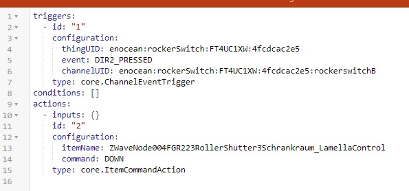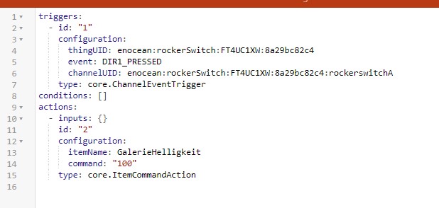 Rules 1&2 react on the trigger sent by an Eltako F6T55B when two of itâs six buttons got pressed. (On that, you can also check my thread https://community.openhab.org/t/eltako-f6t55b-how-to-identify-the-pressed-button on the difficulties I had to get that switch work). Both rules simply turn a light on and off currently.