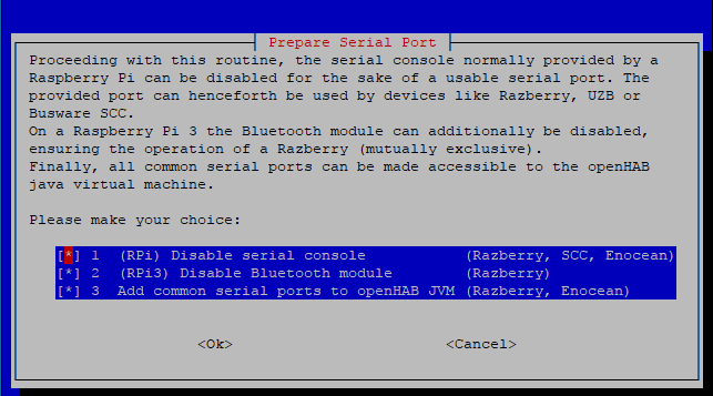 Serial Port Prepare serial ports for peripherals - [*] 1 (RPi) Disable serial console (Razberry, SCC, Enocean)
