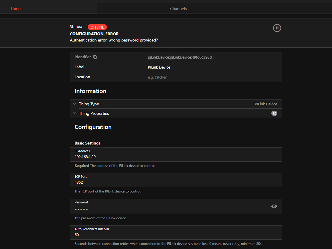 2020-01-11 19:51:09.915 [hingStatusInfoChangedEvent] - ‘pjLinkDevice:pjLinkDevice:192_168_0_52_4352’ changed from ONLINE to OFFLINE (COMMUNICATION_ERROR): Expected prefix ‘%1POWR=’, instead got ‘%1powr=1’