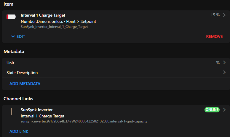 **Known issue: At the moment values changed in the Sun Synk App for the battery settings are not always syncing back with openHAB.**